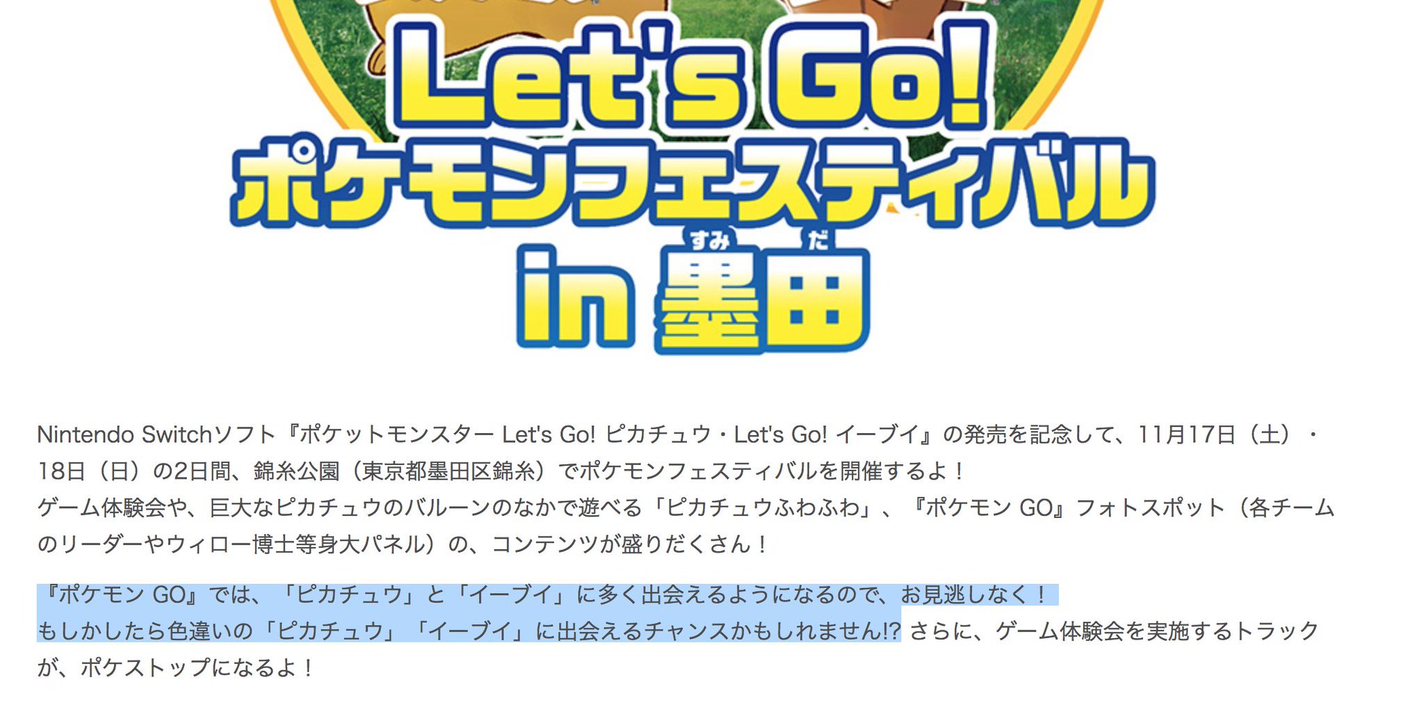 ポケモンgo攻略 Gamewith 11月17日 土 18日 日 の2日間 錦糸公園 東京都墨田区錦糸 でポケモンフェスティバル開催 ポケモンgoではピカチュウとイーブイが大量発生 色違いのピカチュウとイーブイに出会えるチャンスかも だと T Co